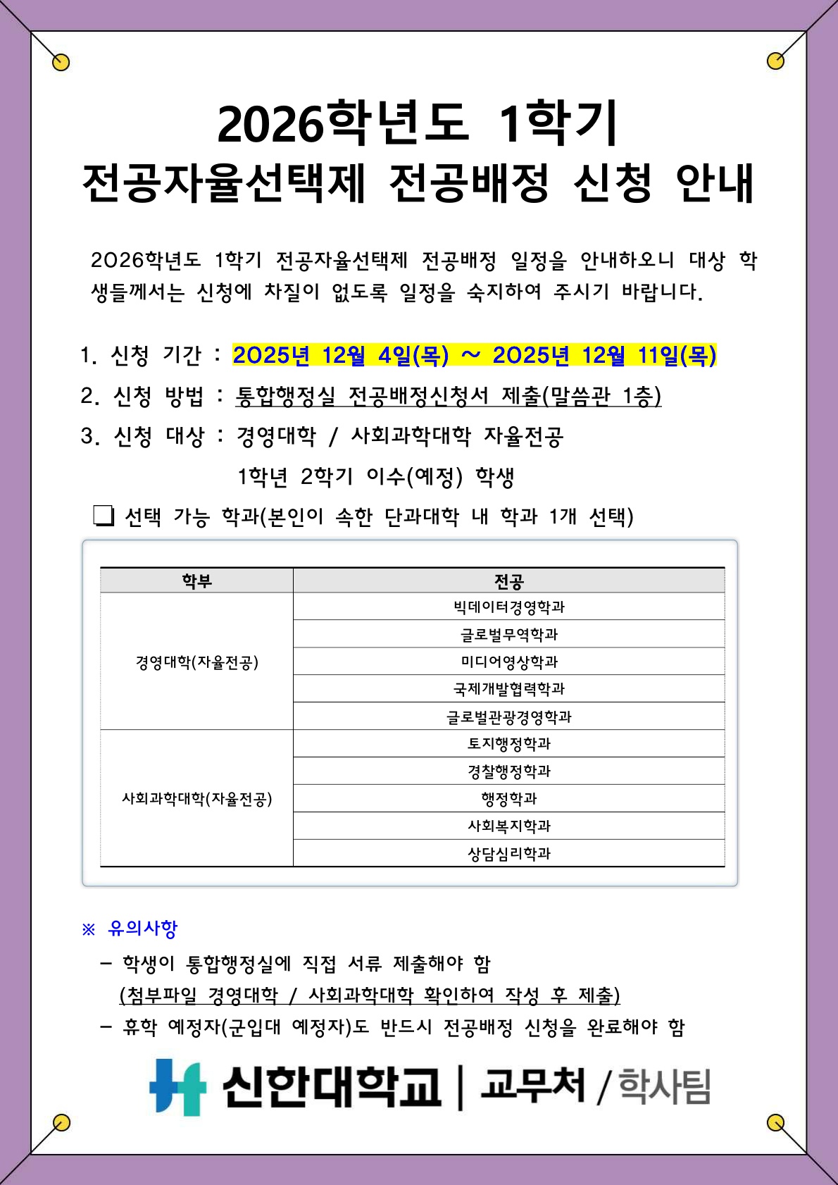 [학사팀/학적] 2026학년도 1학기 전공자율선택제 전공배정 신청 안내